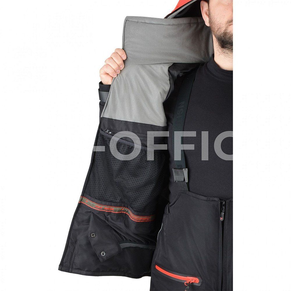 - внутри куртки три кармана с датчиком внутренней температуры: 2 кармана с молниями и объемный карман из сетки;