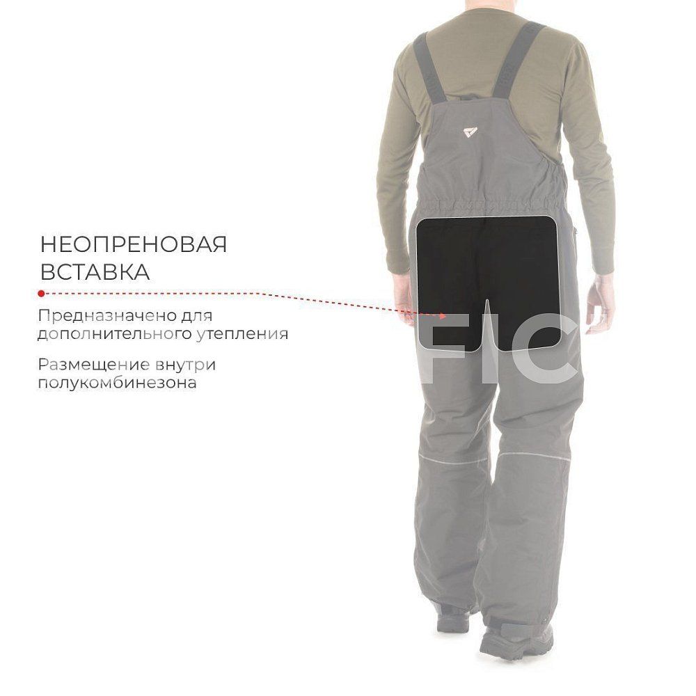 Низ полукомбинезона усилен дополнительно прочной термоустойчивой пленкой Protectfilm австрийского производства. Также изнутри полукомбинезон имеет перфорацию на подкладочной ткани для быстрого вытекания воды.